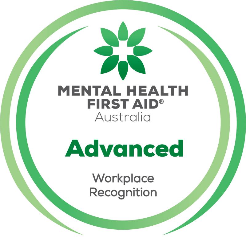 We’re proud to recognised as an Advanced Workplace under the Mental Health First Aid® Australia Workplace Recognition Program. This program celebrates organisations who invest in developing mental health first aid skills in their people and acknowledges their achievement and commitment to embedding MHFA training into their organisation’s culture, through actions such as senior leadership support, relevant policies, supporting Mental Health First Aid Officers and continuous improvement.